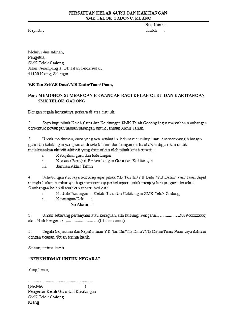 Saya bagi pihak badan kebajikan guru dan kakitangan sk sungai terap ingin memohon sumbangan berbentuk kewangan/ hadiah/ barangan untuk program tahunan yang . Contoh surat rasmi memohon sumbangan kewangan surat rasmi mohon peruntukan dan sumbangan pada 1 4 2016 jumlah. Format gambar contoh surat mohon sumbangan barang yang benar 2019. Peruntukan contoh surat memohon sumbangan kewangan.